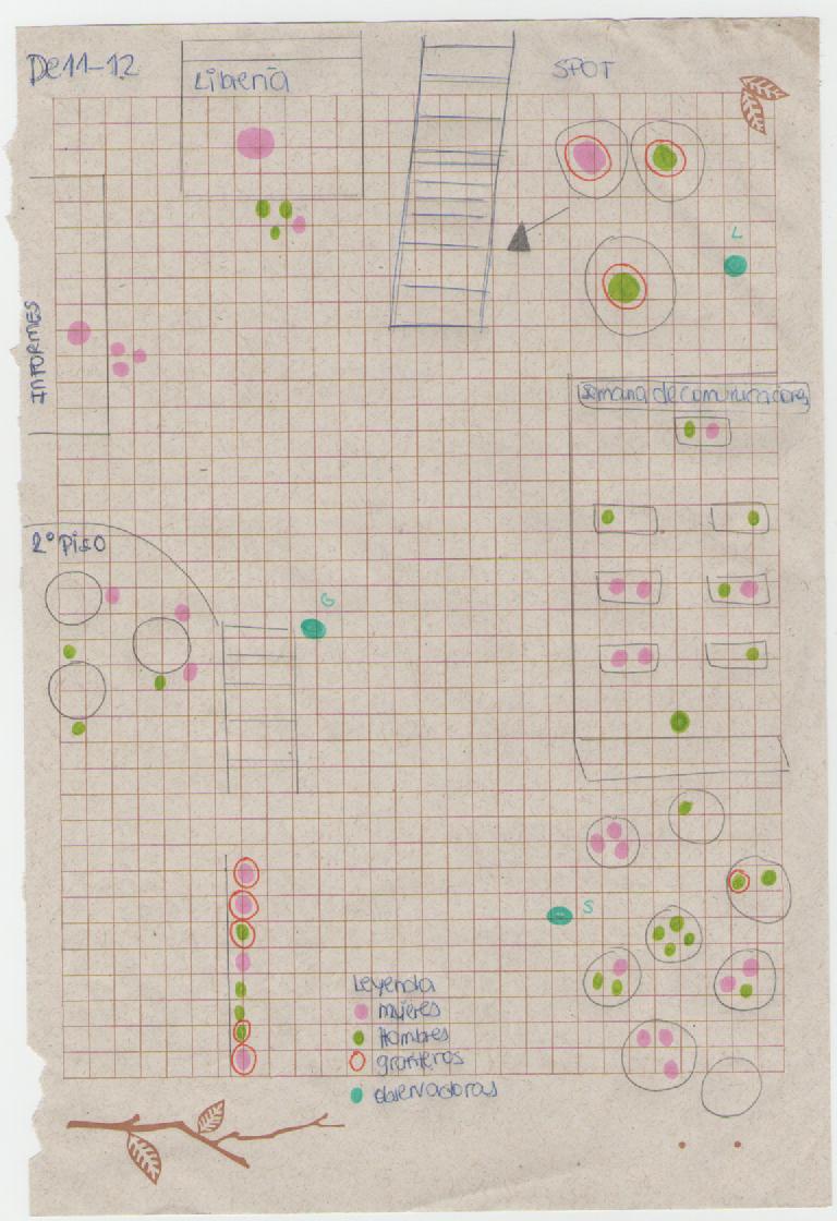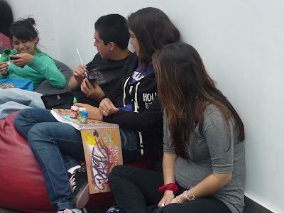 Al llegar a la zona del patio, vimos q muchos chicos estaban sentados en el piso y uno de ellos estaba pintando su celular, con temperas, fue algo que llamo nuestra atención, de tal manera que no pudimos evitarlo y nos acercamos a él y le preguntamos porque lo hacía, respondió con una sonrisa, que estaba aburrido, y le preguntamos si era grafitero y efectivamente, su acto lo delataba.
